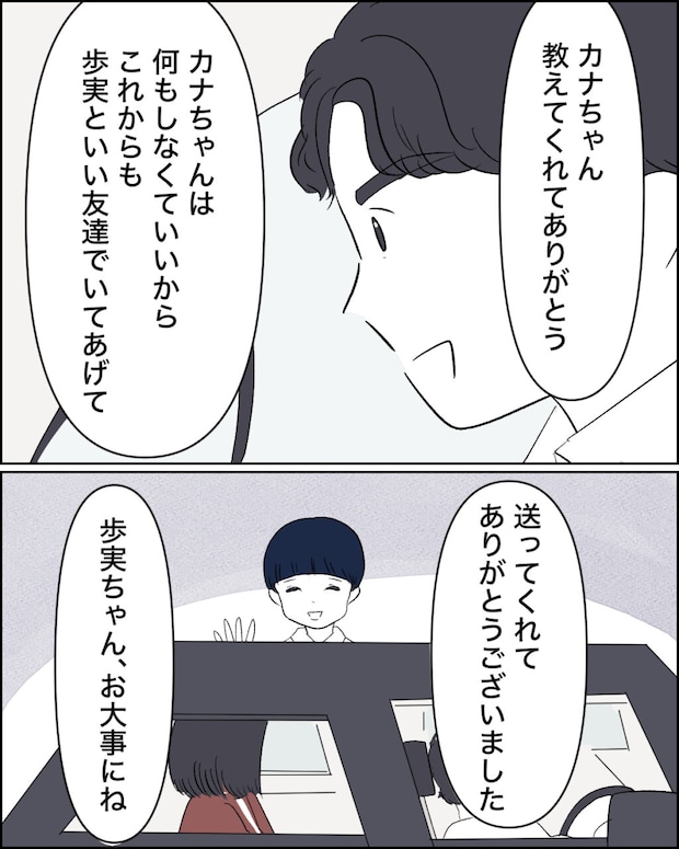 「カナちゃん、教えてくれてありがとう。カナちゃんは何もしなくていいから、これからも歩実といい友達でいてあげて」博之が笑顔でそう伝えました。