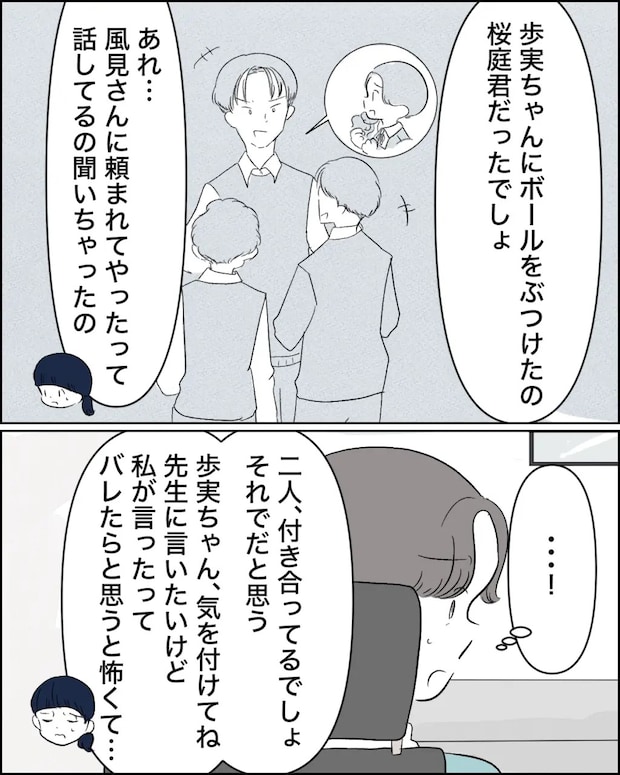 「二人、付き合ってるでしょ、それでだと思う。歩実ちゃん、気をつけてね。先生に言いたいけど、私が言ったってバレたらと思うと怖くて・・」と申し訳なさそうな様子のカナちゃんを見て、
