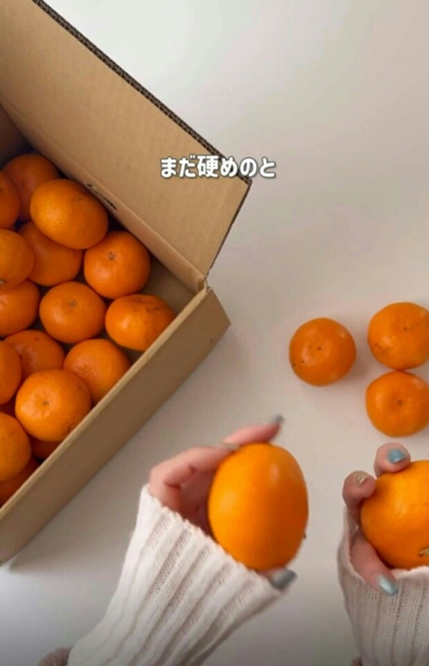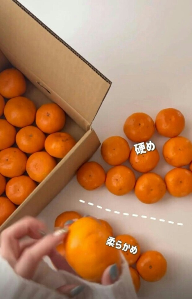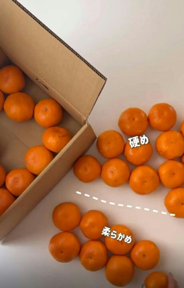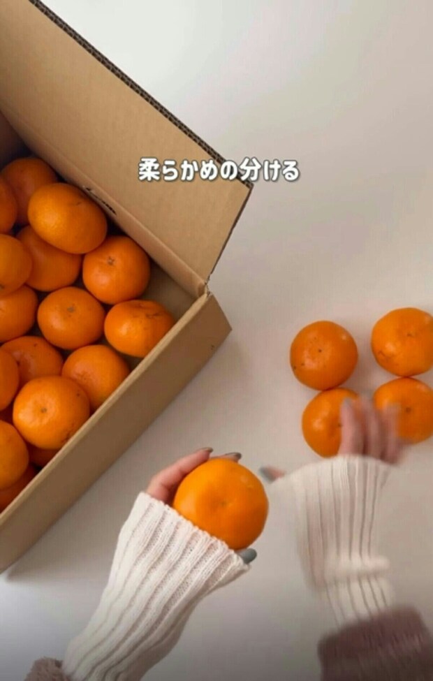 まず、箱に入ったみかんを、柔らかめのものと固めのものに分けます。