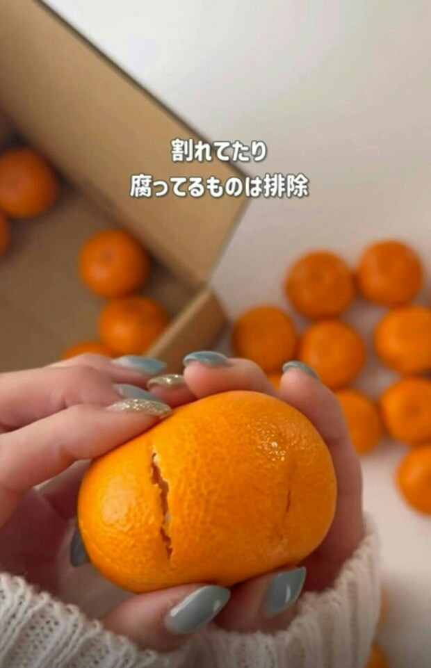ここで、割れている、もしくは腐っているものは全て省いておきます。1つ腐ったものがあると、周りのみかんも傷んでしまうので、しっかり見極めてくださいね。