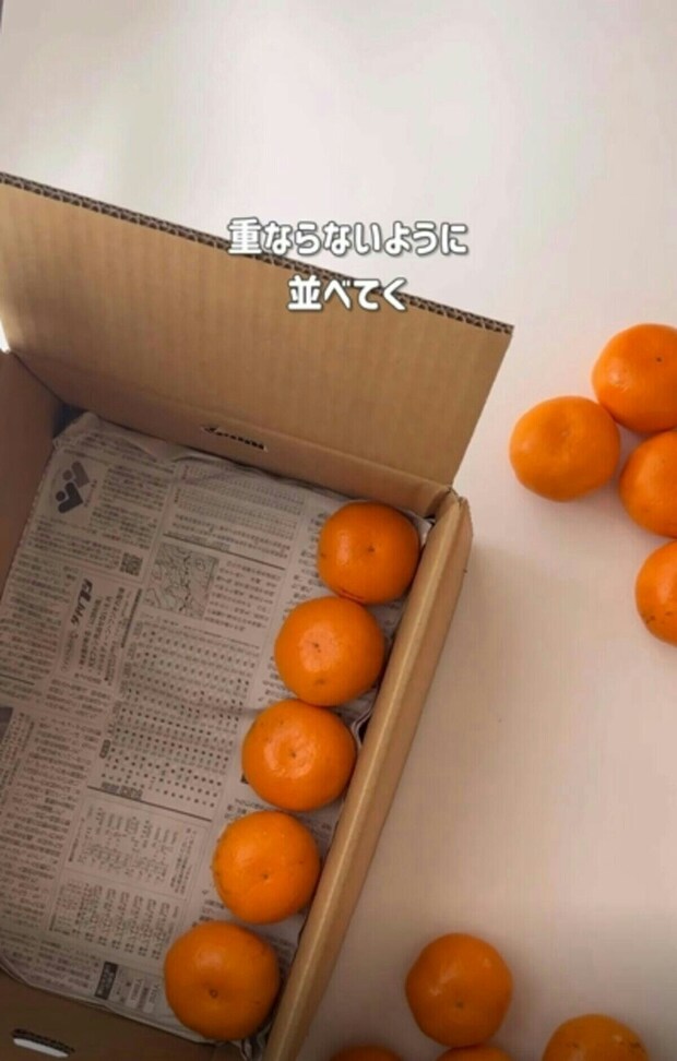 その新聞紙の上に、柔らかめのみかんを重ならないように気を付けて並べていきます。
