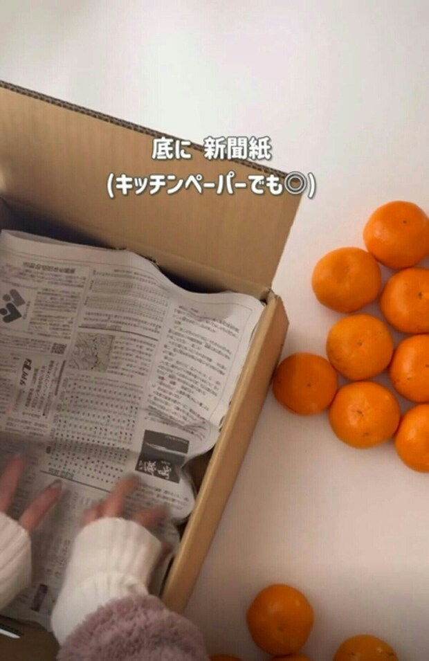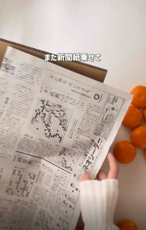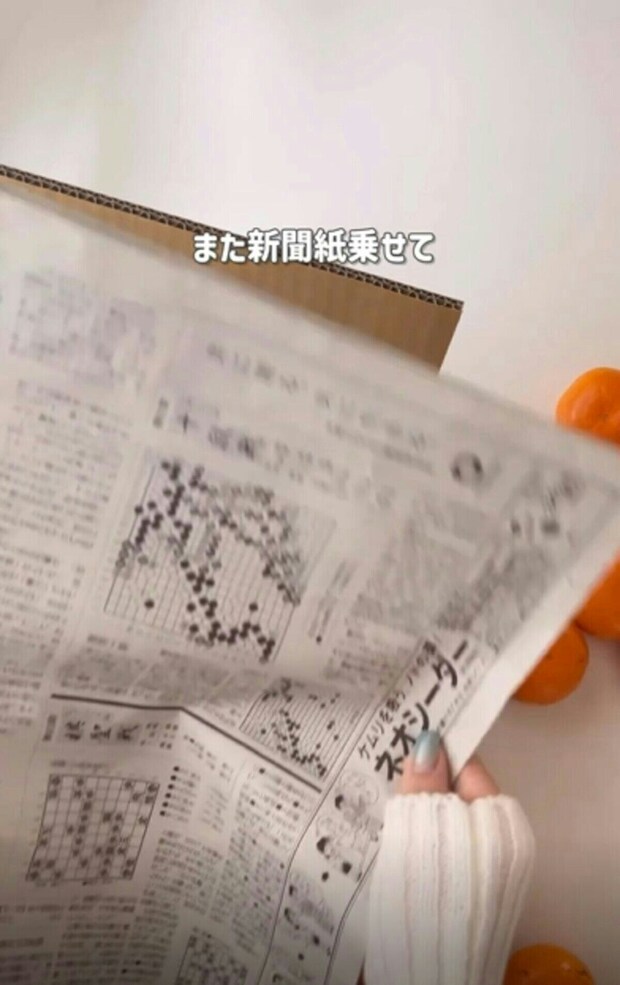 柔らかめのみかんを並べ終わったら、さらに1枚の新聞紙を乗せます。