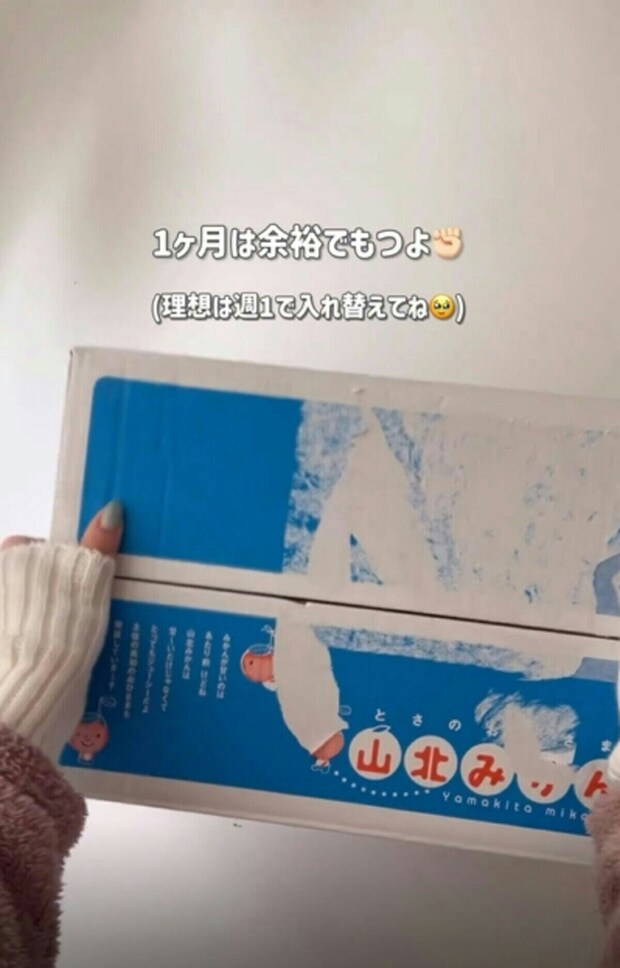 この保存法では、1か月はおいしく食べられる状態を保つことができるとのこと。1週間に1度、みかんの状態を見て入れ替えるとより良いようです。