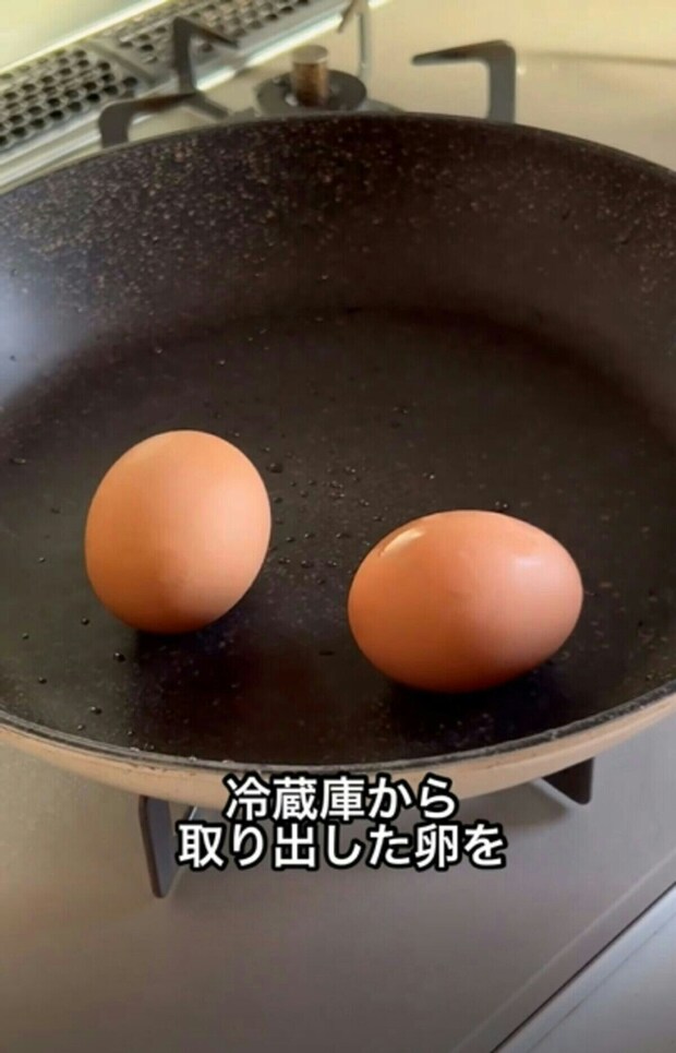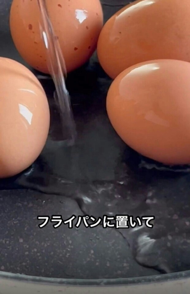 冷蔵庫から取り出した卵をそのままフライパンに並べます。