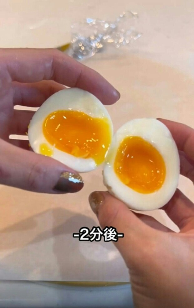 2分後。黄身がかなりトロッとした半熟卵に仕上がっています。