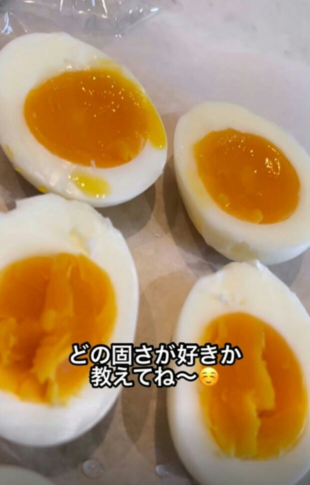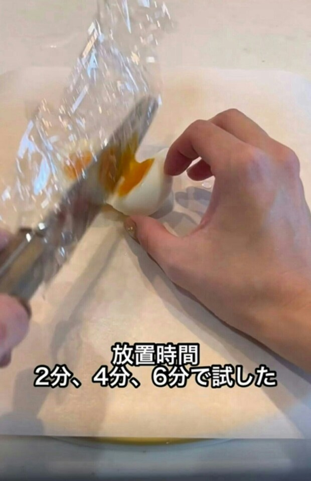 この放置する時間で好みの固さに仕上げることができるとのこと。2分、4分、6分と時間ごとに卵の固さを見比べてみましょう。