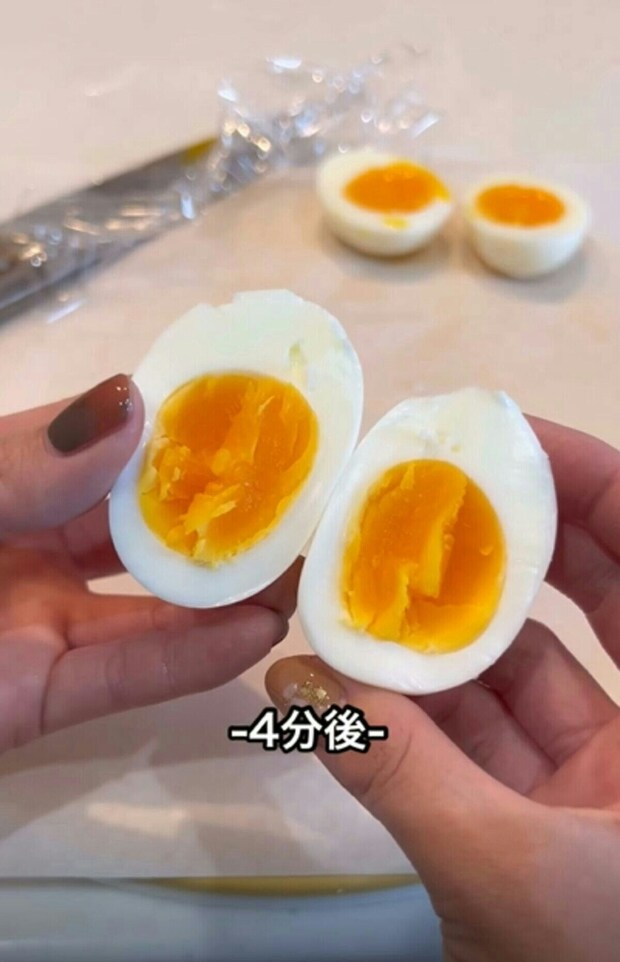 4分後。2分後の卵よりも黄身が固まっており、ほどよく火が通った半熟卵に仕上がっています。