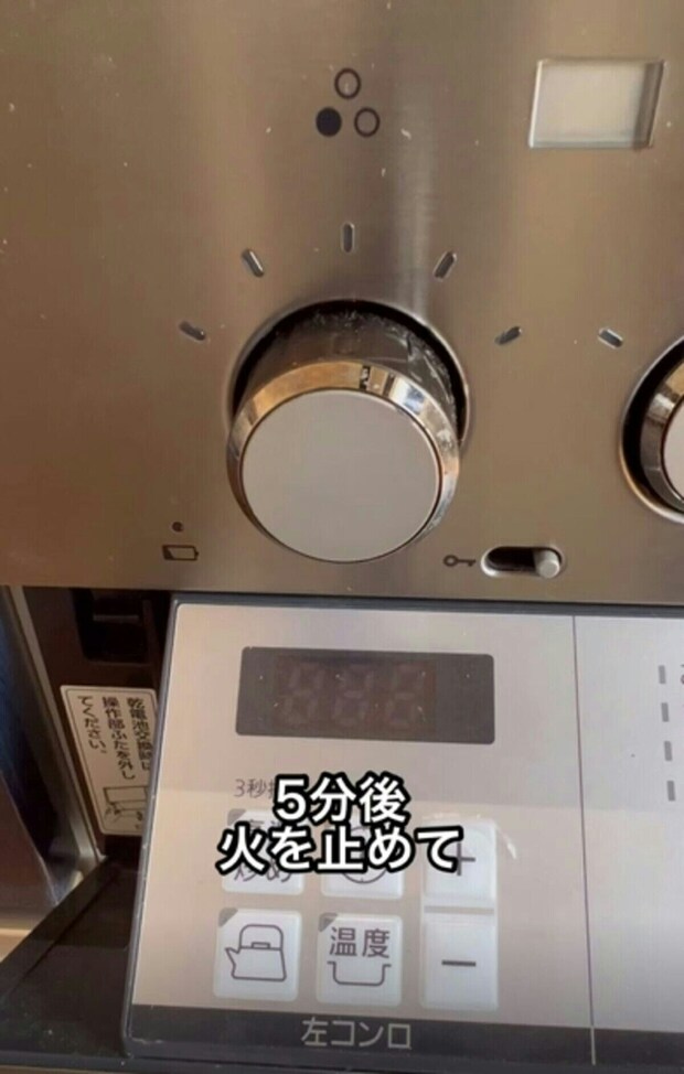 5分後、火を止めます。そして、ふたを閉めたまま放置します。