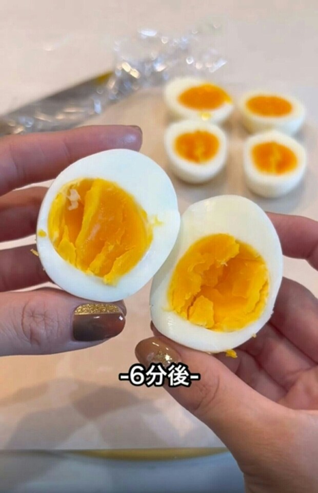 6分後。先ほどよりも火が通っていることが分かります。しかし、固ゆで卵とまではいかず、黄身の柔らかさも感じる仕上がりです。