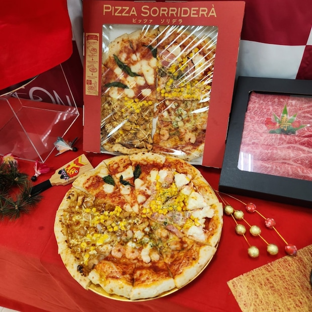 1月1日限定で、「ピッツァソリデラ クワトロ・グラッツィエ L」(税込1,382円)の購入でコカ・コーラ1本がもらえる無料引換券を進呈する(ホールLサイズ購入で1,500ml、ホールレギュラーサイズ購入で700mlを進呈)。ピッツァは「ポテトべーコン」「てりやきチキン」「マルゲリータ」「シーフード」の4種の味が1枚で楽しめ、通常の1.4倍・約35cmのホールLサイズも用意する。