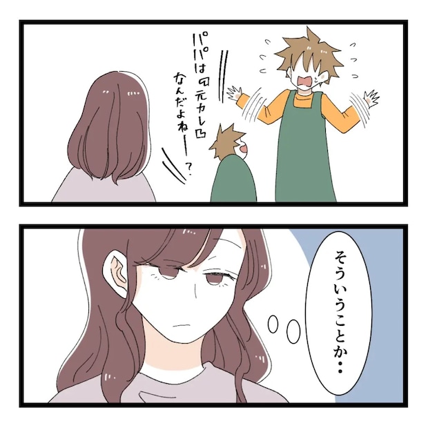 飛んだ勘違いでマイさんに声をかけ、カイさんに自信満々に「元カレ」だと言ってマイさんのことを心配する様子を見せたヒロトさんでしたが、スマートなカイさんに一蹴されて帰宅することに。家についてから、ソウ君が悪気なく「パパは元カレなんだよねー?」と言うのを聞いたアユミさんは、(そういうことか)と状況を理解しました。
