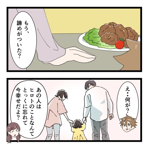 「もう、諦めがついた?」アユミさんは静かにヒロトさんに尋ねました。驚きつつ「何が?」とごまかすヒロトさんに「あの人はヒロトのことなんてとっくに忘れていま幸せだよ?」とアユミさんはこれまで黙っていたことを一気に吐き出しました。