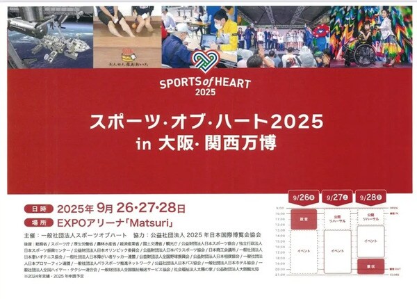 「すべての人が心豊かに暮らせる社会」の実現を掲げ活動しているスポーツ・オブ・ハートが、2025年日本国際万博協会協力のもと、大阪・関西万博にて延べ18万人参加予定の大規模イベント「スポーツ・オブ・ハート2025 in 大阪・関西万博」を、万博のメインアリーナであるEXPOアリーナ「Matsuri」にて9月26日(金)・27日(土)・28日(日)の3日間開催。