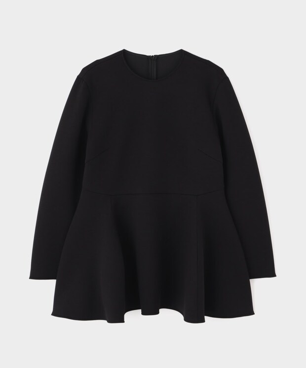 可愛げのある構築的なペプラムシルエットのこちらのトップスは、ふくらみのあるダンボールジャージ素材の質感が立体的なフォルムを美しくキープしながら、ふんわりと快適な着心地を叶えてくれています。切り替えを入れて立体的なペプラムフレアを表現しているので、規則的な広がりではなく、着用時にフォルム感のある美しいシルエットが際立ちます。ペプラム部分以外は非常にミニマルなデザインなので、シンプルななかにクチュールライクなムードが漂い、トゥーマッチにならない甘さも40代にふさわしいのではないでしょうか。