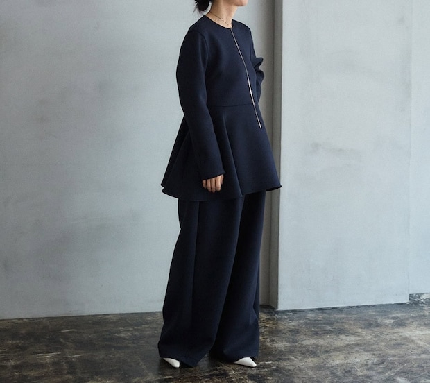 こちらは同素材のワイドパンツとセットアップで着用。ボトムがワイドシルエットなので、ペプラムの甘さがそこまで強調されず、モダンな印象に。