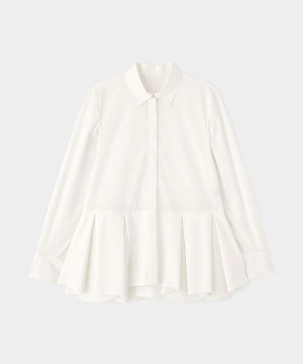 最後にご紹介するのは、軽やかな風合いと機能性を兼ね備えたSOLOTEXブロード素材を使用したブラウスです。特徴は、カーブヘムのタックのペプラムデザイン。タックが開いたときに自然な丸みと揺らぎが生まれるよう計算された設計になっていて、所作を美しく見せてくれるんですよね。花びらを想起させるような柔らかな曲線が、華やかで上品。フロント部分はシンプルなシャツのような仕様になっているので、すっきりとシャープさも兼ね合わせています。他色展開のアイテムで、カラーによって印象がガラッと変わるので、ぜひ店頭でチェックしてみてください。写真のホワイトはクリーンさが魅力です。