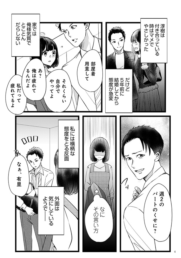 付き合っている時はマメで優しかった夫が、結婚して5年経つと態度が急変。そんな俺様気質でだらしない夫・淳樹だったが、妻の有里は逆らえずにいた。有里は妊活のために正社員を辞めたが、妊活どころか結婚生活も上手くいっていない。さらには夫の不倫疑惑が浮上する。たまらずに家出をした有里は、ひょんなことから夫の元不倫相手とルームシェアをすることになり…!?
