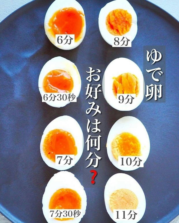 上の画像はゆで時間による黄身の変化。30秒でかなりの差がありますよね。どのゆで卵がお好みですか?ちなみに筆者は6分30秒ゆでた、半熟卵が好みです!