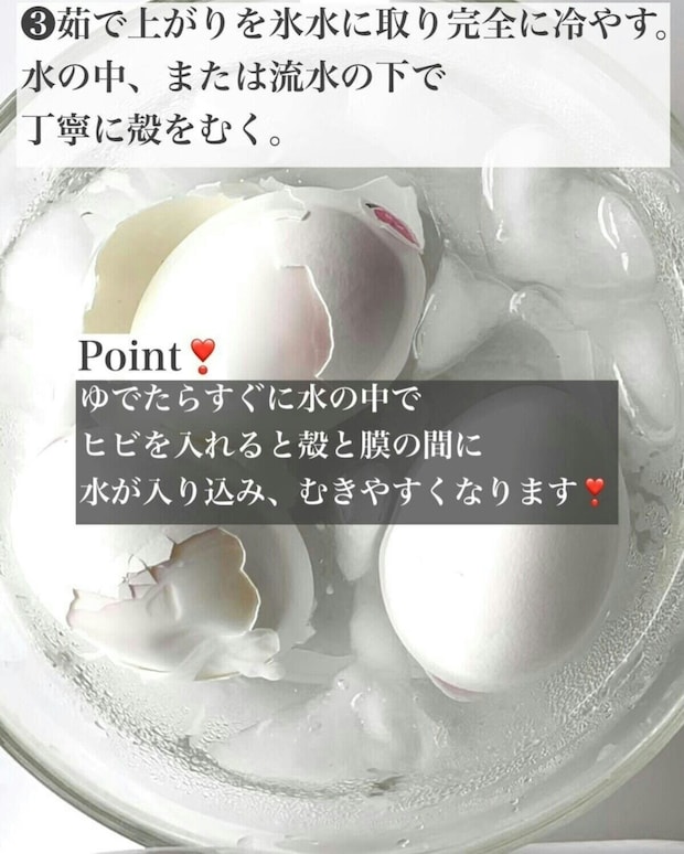 ゆで上がった卵を氷水でしっかりと冷やします。このとき、水の中でひびを入れておきます。こうすることで殻がむきやすくなるようです。