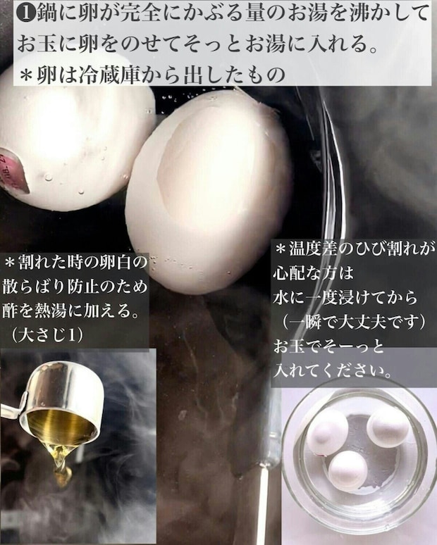 あーぴん(道添明子)料理研究家【料理・レシピ・献立】さんのおすすめする手順でゆでれば、毎回思った通りのゆで卵を作ることができるようです。さっそく見ていきましょう。