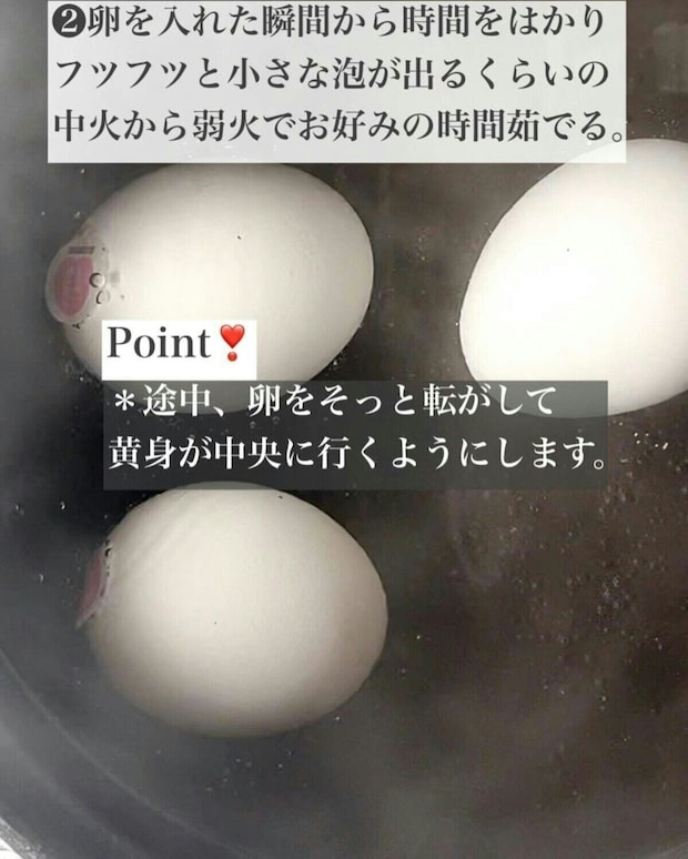 火加減は、小さな泡が出る程度の中火~弱火として、途中で卵を優しく転がします。こうすることで、黄身が中央になるとのことです。