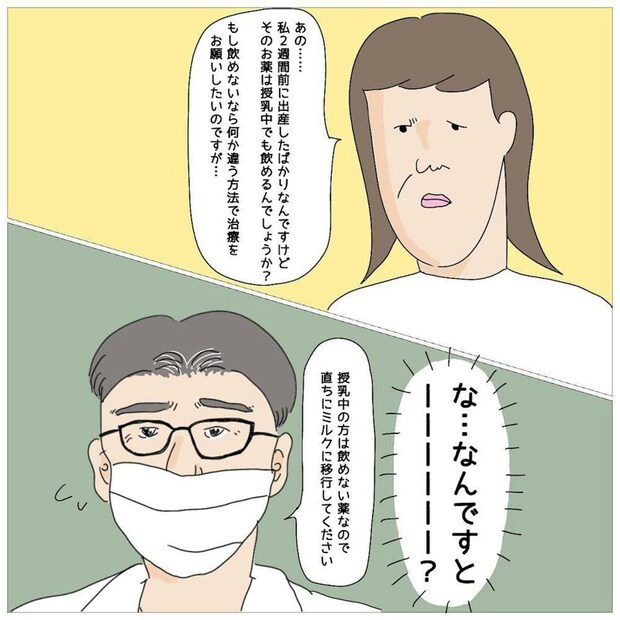 顔面神経麻痺の中程度と診断され、服薬での治療を始めることになったみうらまるこさん。薬の影響が出てしまうので、母乳は中断しミルクに移行するよう指導を受けます。