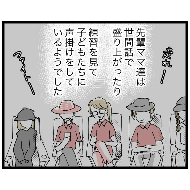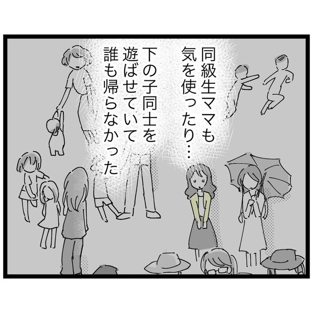 先輩ママたちは世間話で盛り上がり、同級生ママたちは気を使っているよう。もっつんさんは、帰るに帰れなくなってしまいました。