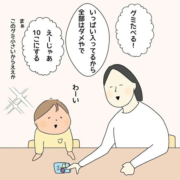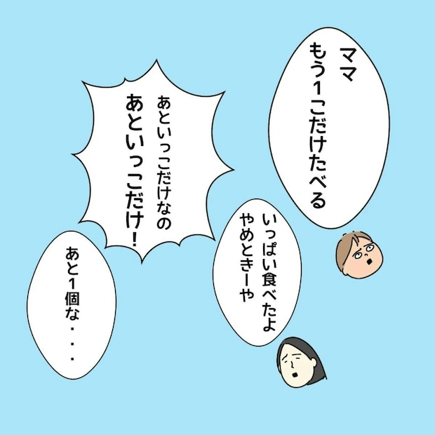 本当にあといっこだけ?言うことを聞かない息子を怒るよりも、ママはこの状況を楽しんでいる様子。このあと、息子はなんて言うのか聞いてみたいですね。