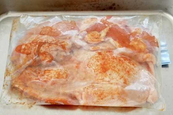 ポリ袋にスパイスともも肉を入れ、よく揉み込んだら10分以上おきます。今回は冷蔵庫で5時間寝かせておきました。