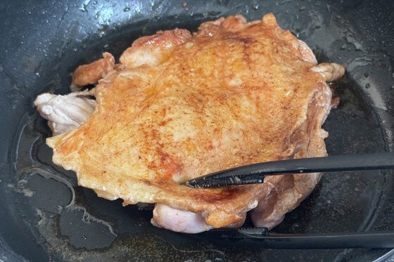 2. フライパンにサラダ油を熱し、皮目を下にしてふたをして焼き、ひっくり返して裏面もこんがり焼いたら完成です!