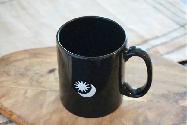 ツヤのある漆黒のベースに、プロントのロゴがプリントされたマグカップ。つくりが厚めなので安定感があります。