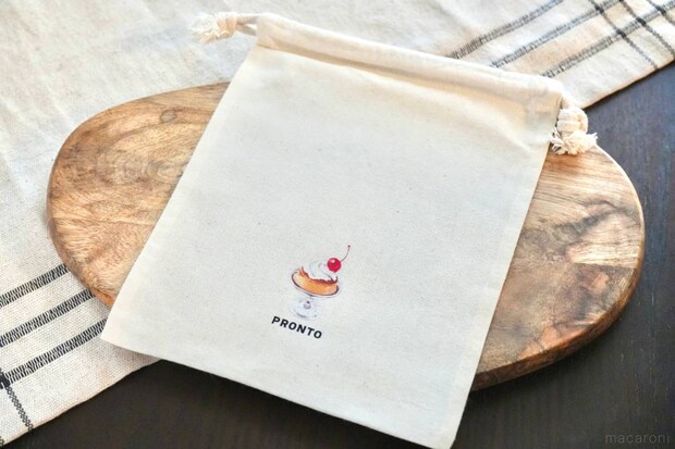 リアルなタッチのかわいいプリンとPRONTOのロゴがプリントされた巾着。生成色のコットン地が普段使いしやすいですね。※サイズは筆者計測による目安です。
