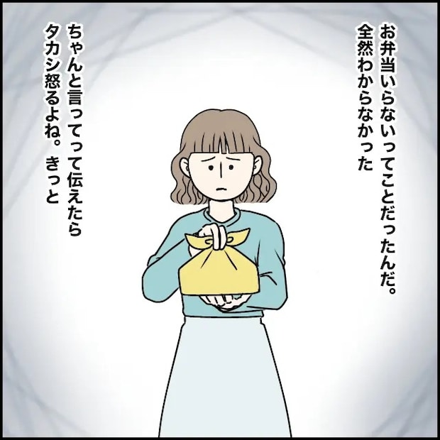 お弁当いらないってことだったんだ。全然わからなかった。ちゃんと言ってって伝えたらタカシ怒るよね。きっと。といらないと言われたお弁当を持ったまま考え込んでいました。