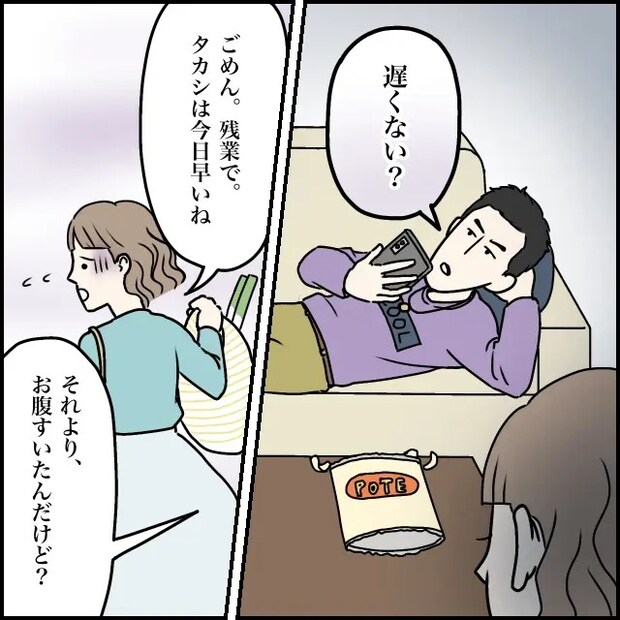 「遅くない?」ソファに寝っ転がってスマホ片手にそう言うタカシ。おやつにスナックを食べたんだなと思いつつ、「ごめん。残業で。タカシは今日早いね」と言うと、「それより、お腹すいたんだけど?」とタカシに言われ、