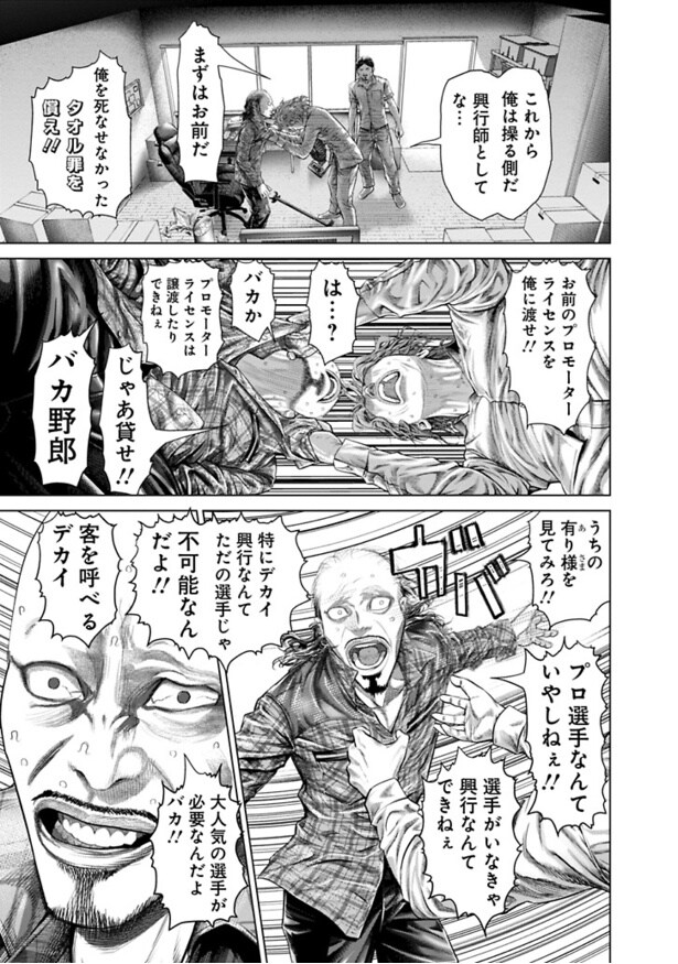 元プロボクサーの針磨梁は、ある試合をきっかけに2年間の昏睡状態に陥る。目覚めた矢先に待っていたのは、選手生命の終了通告と最愛の父親の死、そして所属ジムによる裏切りだった――。金儲けのためだけに自分を利用してきた“げにかすり”たちへの怒りと悲しみに震える針磨は、興行師(プロモーター)としてボクシング界でのし上がることを誓う。