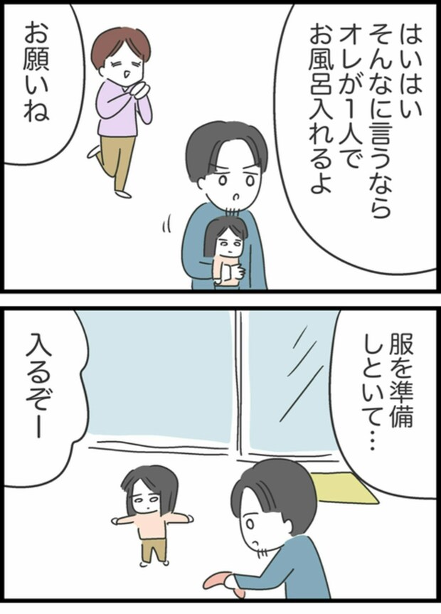 すると夫は、「ひとりでできる!」と豪語し、子どもと共にお風呂へと向かいます。