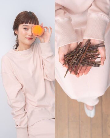 2023年発売の第二弾、大澤果樹園のももの剪定枝で染めたスウェットとスカートに続き、