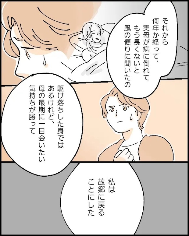 「それから何年か経って、実母が病に倒れてもう長くないと風の便りに聞いたの。駆け落ちした身ではあるけれど、母の最期に一目会いたい気持ちが勝って、私は故郷に戻ることにしたの」