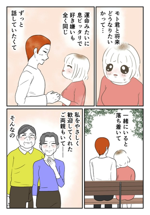 将来、「自分とどうなりたいか考えてほしい」と、モトさんに言われた尾持さん。趣味や好みが合い、息もぴったり。一緒にいると落ち着き、ご両親も優しい…そうなれば、尾持さんの答えは一つでした。