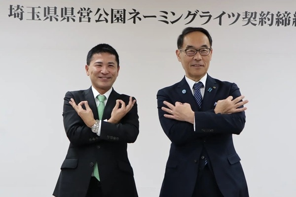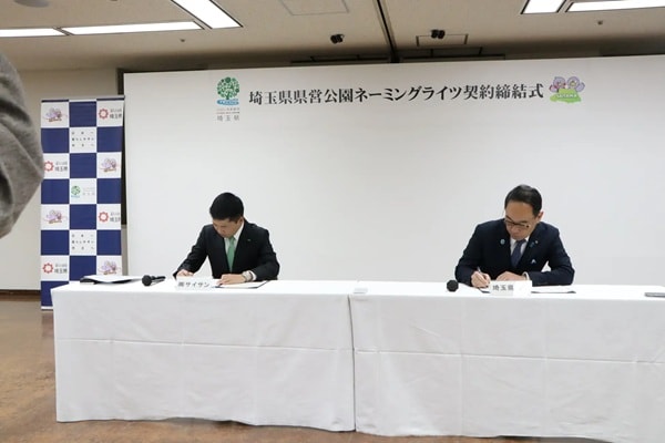 2025年12月24日(水)に行われた契約締結式では、埼玉県の県営公園ネーミングライツ事業にて採択された18の企業・団体を代表して、サイサン社長の川本知彦氏が大野元裕埼玉県知事と契約書に署名をした。
