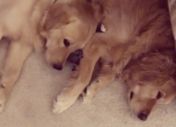 犬さんの腕にぎゅっと抱きつく子猫が!