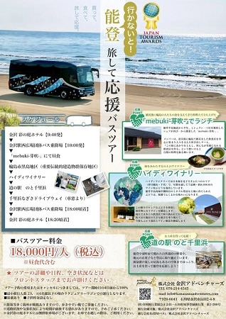 地域に根差し北陸の魅力を余すところなく発信している、石川県金沢市の旅行会社「金沢アドベンチャーズ」が企画・運営する「『行かないと!能登』旅して応援バスツアー」が、日本観光振興協会、日本旅行業協会、日本政府観光局が開催する第9回「ジャパン・ツーリズム・アワード」において、審査員特別賞を受賞した。