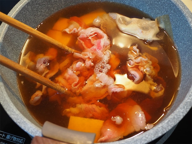今回のレシピのポイントは、「できればおいしいだしパックを使うこと」と「脂分の少ない牛肉を使う場合は、加熱のしすぎに注意すること」。