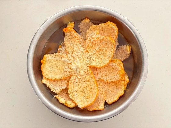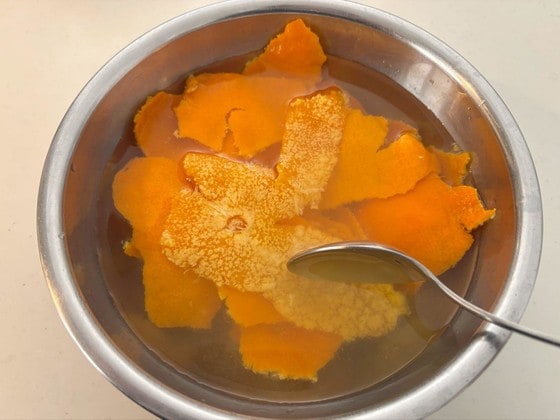 3を水に取り、スプーンで皮の白い部分を削るように取ります。水で洗ったら、水気を切っておきましょう。