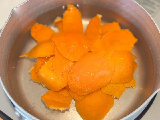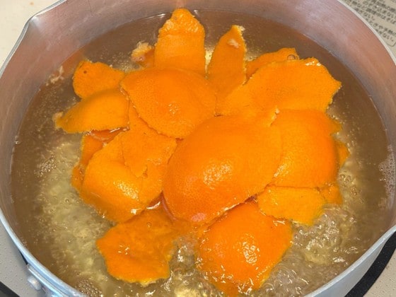 好きな量のみかんの皮をお湯で洗います。水と砂糖は皮の半量を用意しておきましょう。