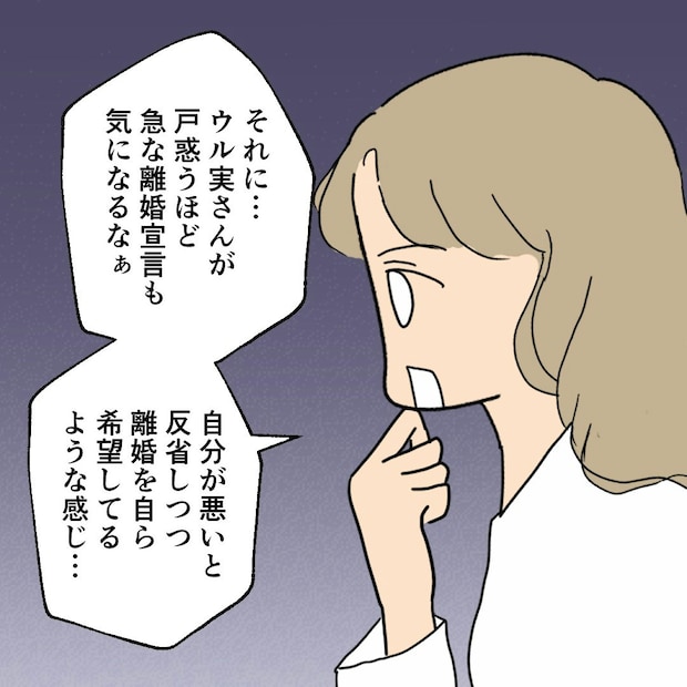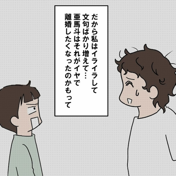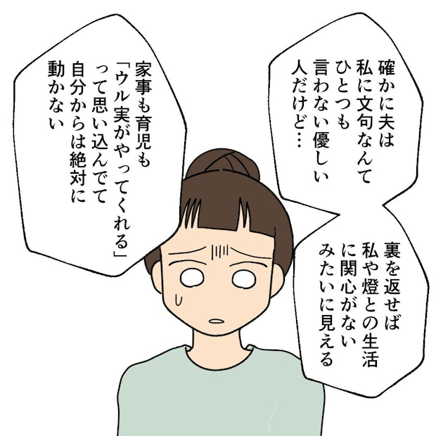 家事育児に無関心すぎて、口も手も出さない亜馬斗。ウル実は、そんな亜馬斗に、口うるさく文句を言うことが増えました。亜馬斗には、それが負担になって、離婚をしたくなったのかもしれない…と、ウル実は自己嫌悪におちいっています。