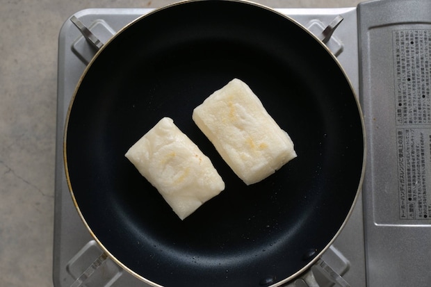 熱したフライパンで餅を焼きます。表面がカリッとして中がやわらかくなればOKです。