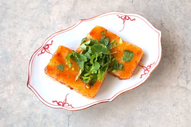 皿に盛り付け、刻んだパクチーをトッピングすれば完成です。