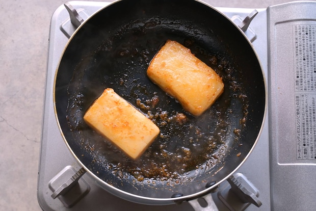 合わせたタレをフライパンに入れ、餅に煮絡めます。