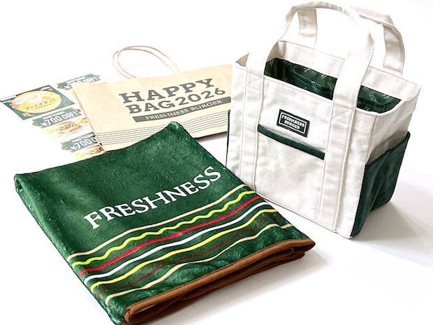 フレッシュネスバーガーの「HAPPY BAG 2026」は、オリジナルのトートバッグとブランケットが入った福袋。さらに3,500円分のフードチケットもセットになっています。